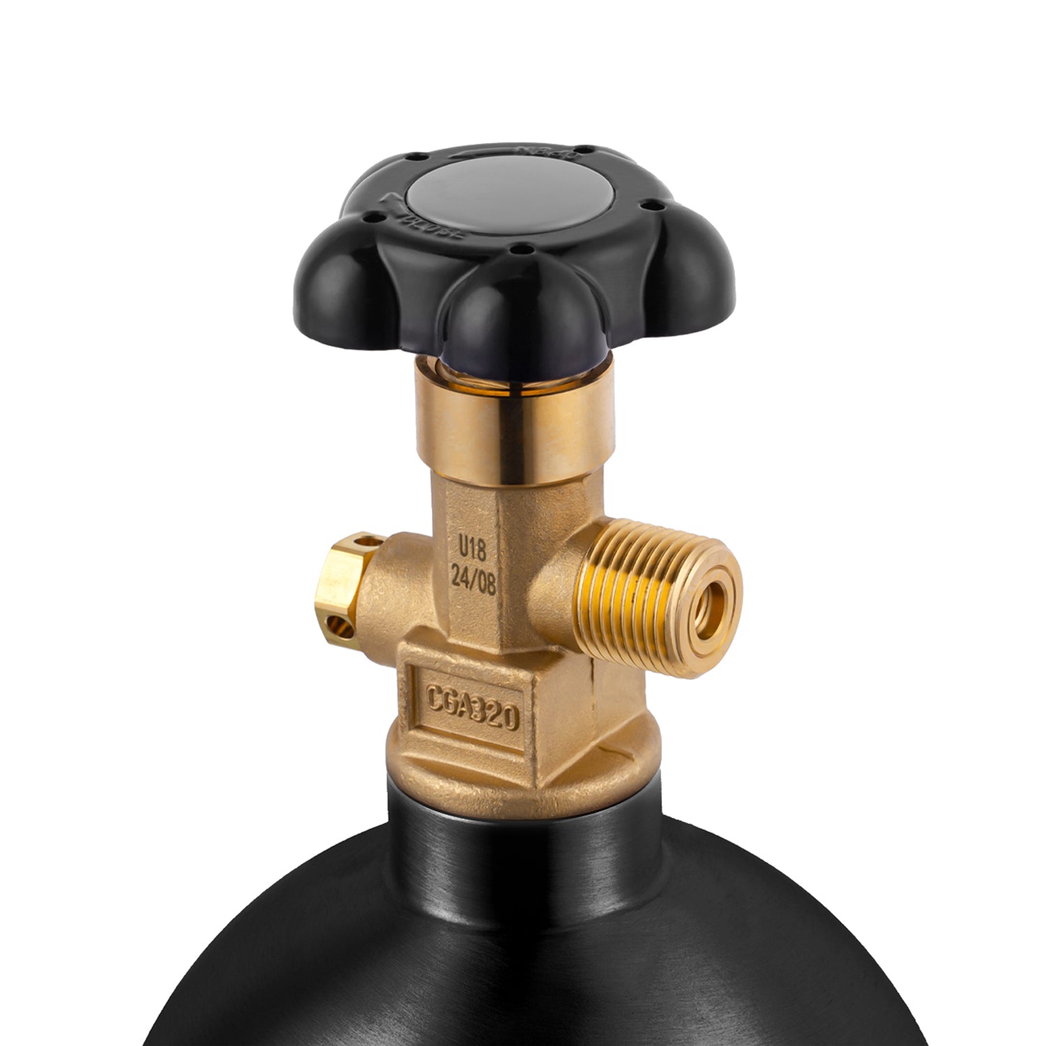 This CO2 Tank features a pre-installed CGA-320 valve and a male thread for CO2 regulators. The valve supports an 1800 PSI service pressure and 3000 PSI test pressure for diverse applications.