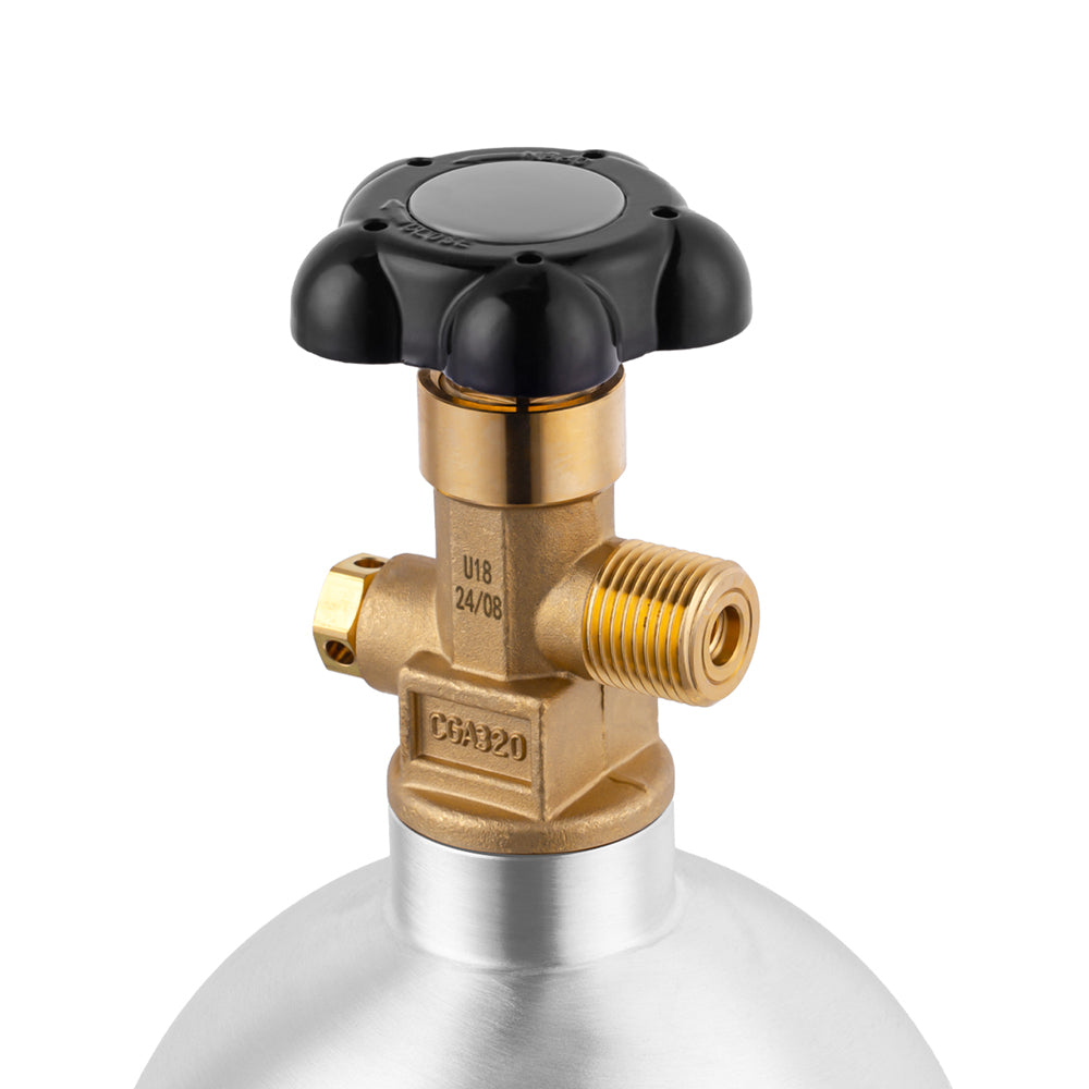 This CO2 Tank features a pre-installed CGA-320 valve and a male thread for CO2 regulators. The valve supports an 1800 PSI service pressure and 3000 PSI test pressure for diverse applications.