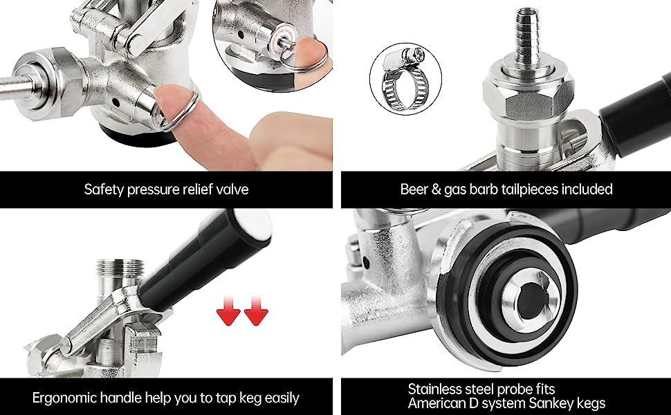 The pressure relief valve of keg tap coupler will automatically open on about 55 psi, allows excessive pressure gas to escape before it enters the keg. Silicone check valves and beer line washers between the coupler and the barb tailpiece give a great sealing performance to prevent leaking and backflow.