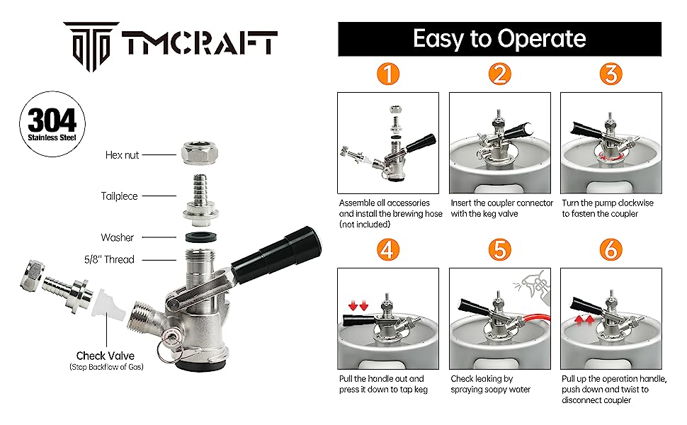 TMCRAFT keg coupler features a chrome-plated brass body and stainless steel probe as well as a more sturdy lever handle, which meet ergonomic standard. The special construction will ensure wear reduction and retain beer flavor after long periods use.